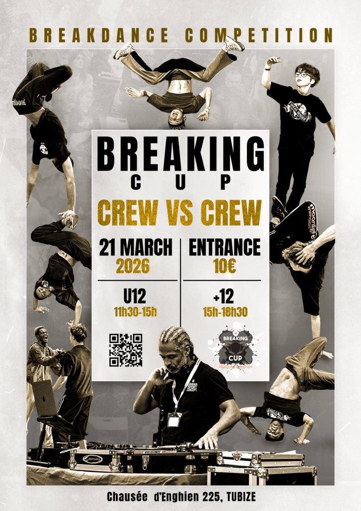 BREAKING CUP est une compétition internationale de Breakdance situé à Tubize (Belgique). Cette compétition est divisé en 3 catégories (-12 ans, -16 ans et 16 ans et plus) avec un règlement sportif et un système de jugement objectif qui reprend toutes les bases du Breakdance (Techniques et Artistiques). Cet évènement met en avant l’aspect sportif et artistique de cette discipline qui plus est devenu un sport Olympique depuis leur essaie au Jeux Olympique des jeunes à Buenos Aires en 2018.